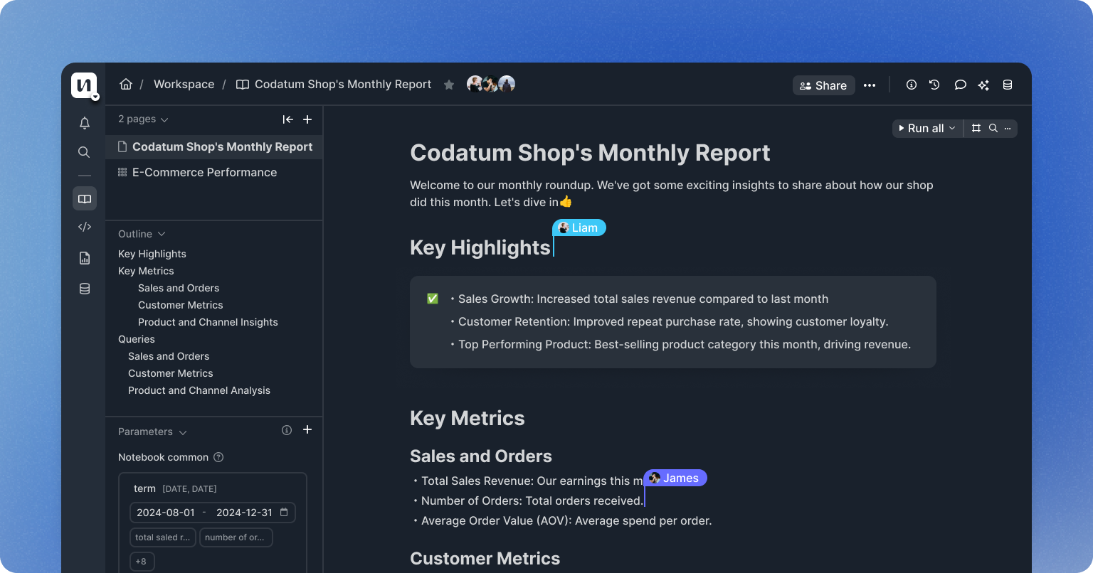 ノートブックはリアルタイムの共同編集機能を備えており、複数のユーザーが同時に作業でき、コメントの追加や他のユーザーへのメンションも可能です。